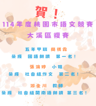 賀!!!本校學生及教師參加114年度大溪區語文競賽成績優異!五年甲班簡祺霖同學榮獲「國語朗讀」第1名!感謝謝潘筑甄老師的指導張淯婷小姐榮獲社會組「作文」第2名!游金川教師榮獲社會組「閩南語朗讀」第3名!